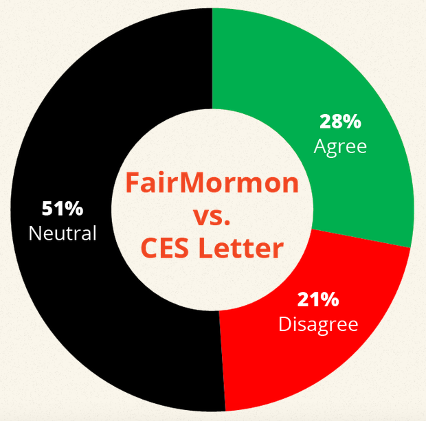 According to Runnells, “The above donut chart shows percentages of the entire Letter to a CES Director that FairMormon is in agreement, disagreement, and neutral on. If one assumes that FairMormon’s undisputed silence is acceptance of the facts, FairMormon agrees with 79% of Letter to a CES Director.”
